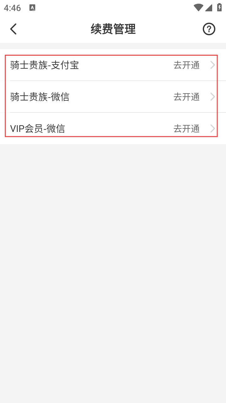 4、在续费管理页面,可选择【骑士贵族-支付宝】【骑士贵族-微信】【VIP会员-微信】等选项,点击去开通,进行相应续费操作。