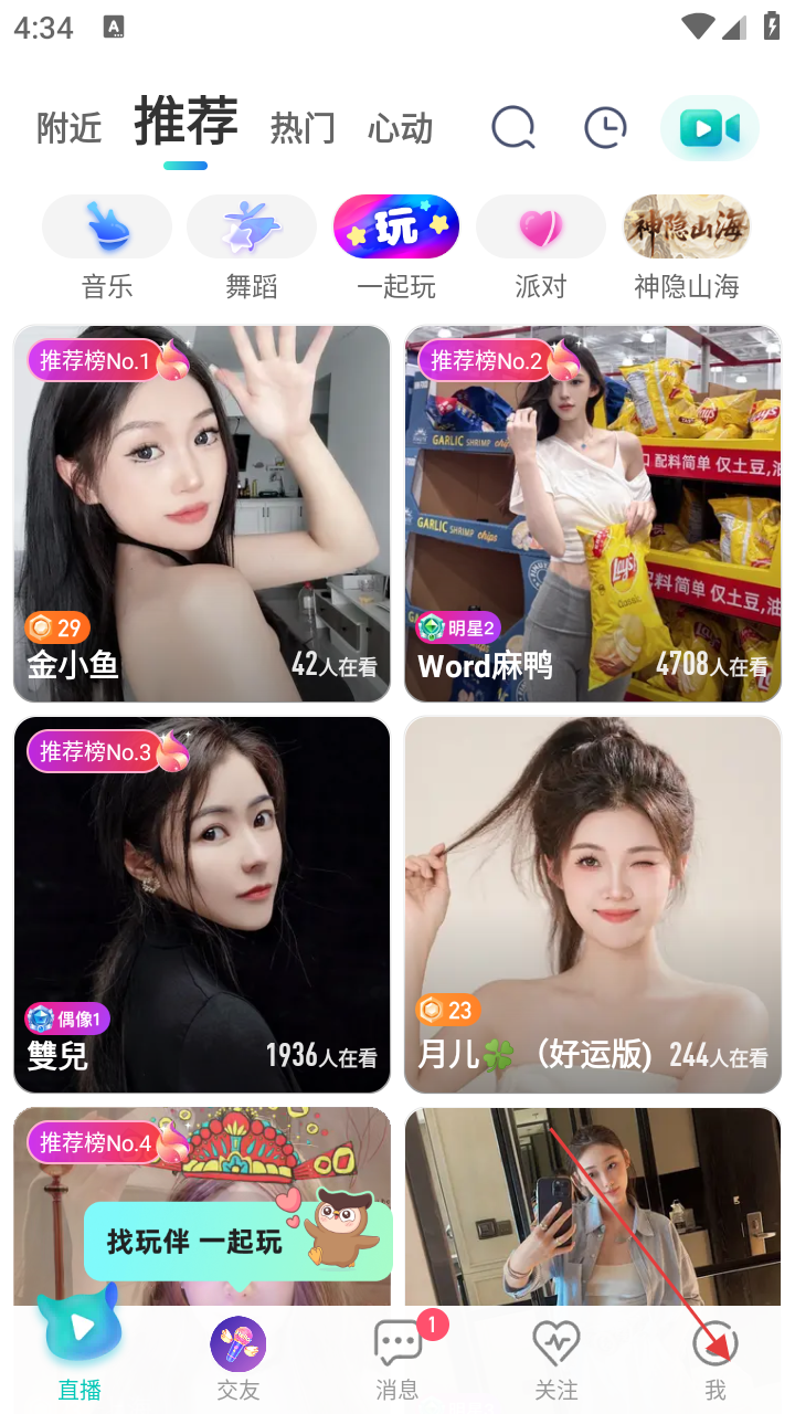 1、在软件直播页面,若要进入个人相关页面,点击底部【我】,切换到个人页面。