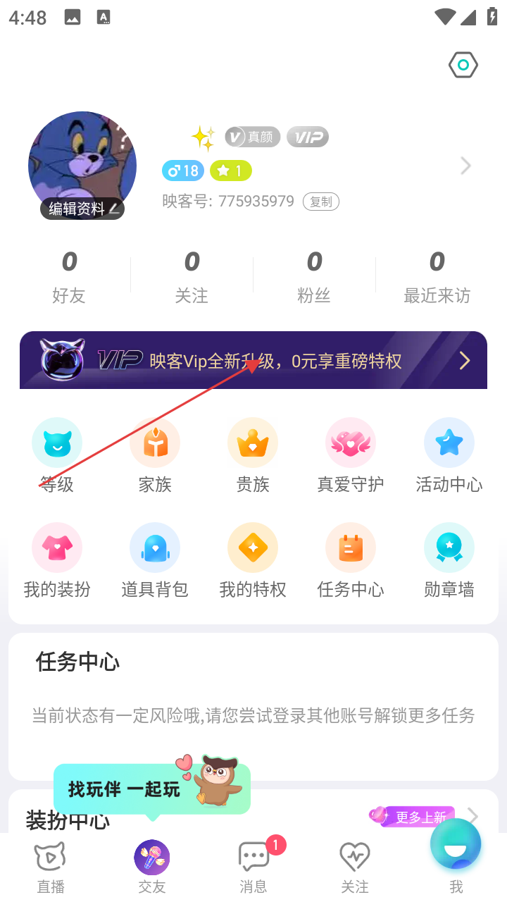 2、进入个人页面后,点击【映客Vip全新升级,0元享重磅特权】区域,进入映客会员页面。