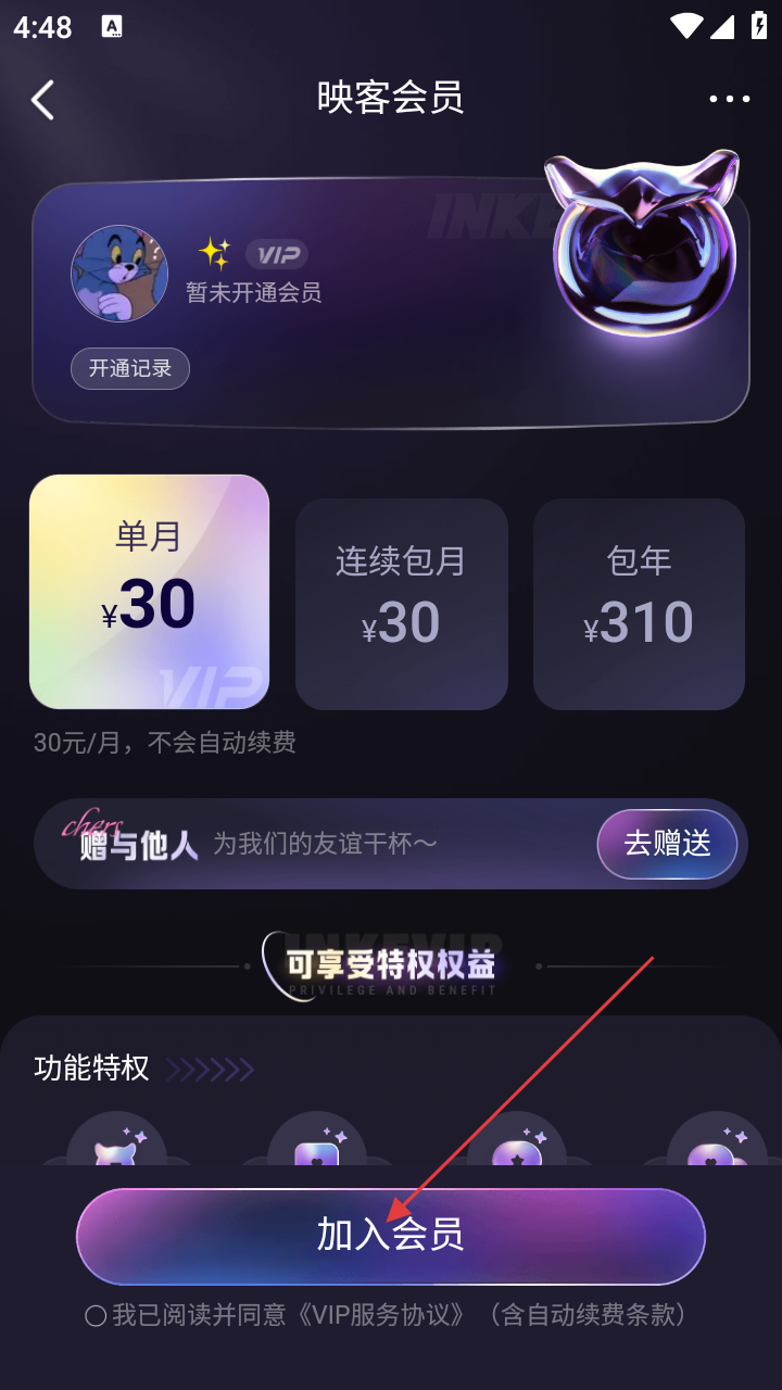 3、在映客会员页面,选择会员类型后,点击【加入会员】按钮,弹出确认开通弹窗。