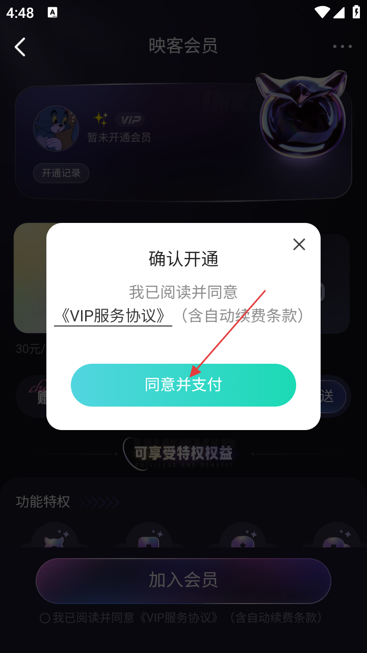 4、在确认开通弹窗中,点击【同意并支付】按钮,即可进行会员开通支付操作。