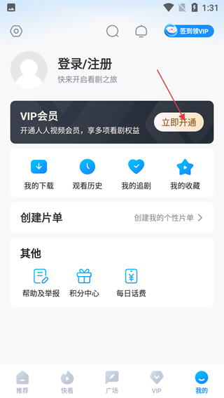 2、点击底部【我的】进入个人中心,选择【立即开通】VIP会员选项,进入VIP开通页面。