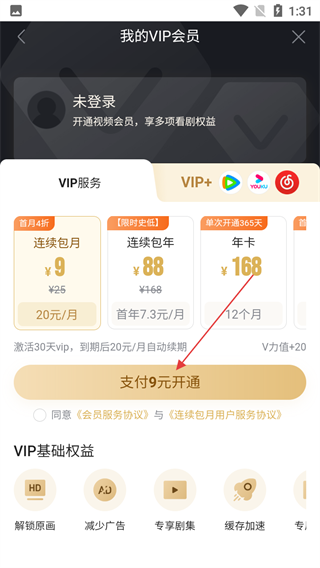 3、在VIP开通页,选择目标套餐,点击【支付开通】按钮,触发“请同意服务协议”提示。