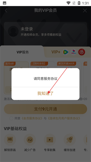 4、点击提示框中的【我知道了】,勾选《会员服务协议》与《连续包月用户服务协议》后,即可完成VIP会员的支付开通流程。