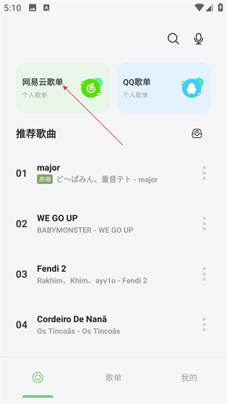 1、在音乐软件歌单页面,点击【网易云歌单】选项,进入网易云个人歌单页面。