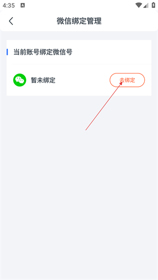 4、在微信绑定管理界面,若当前账号暂未绑定微信,点击【去绑定】按钮,按提示完成微信账号的绑定操作,提升账号登录的便捷性。