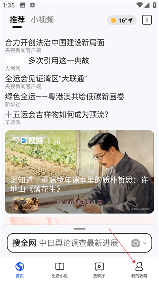 1、在搜狗浏览器极速版主界面,点击底部【我的收藏】,进入个人中心页面,可进行账号管理和功能设置等操作。