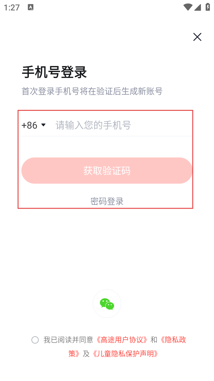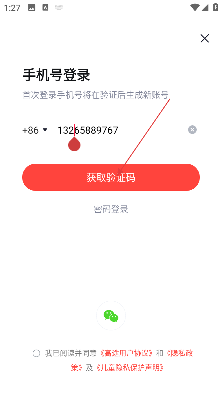 4、输入手机号码后,点击【获取验证码】按钮,获取验证码进行后续登录。