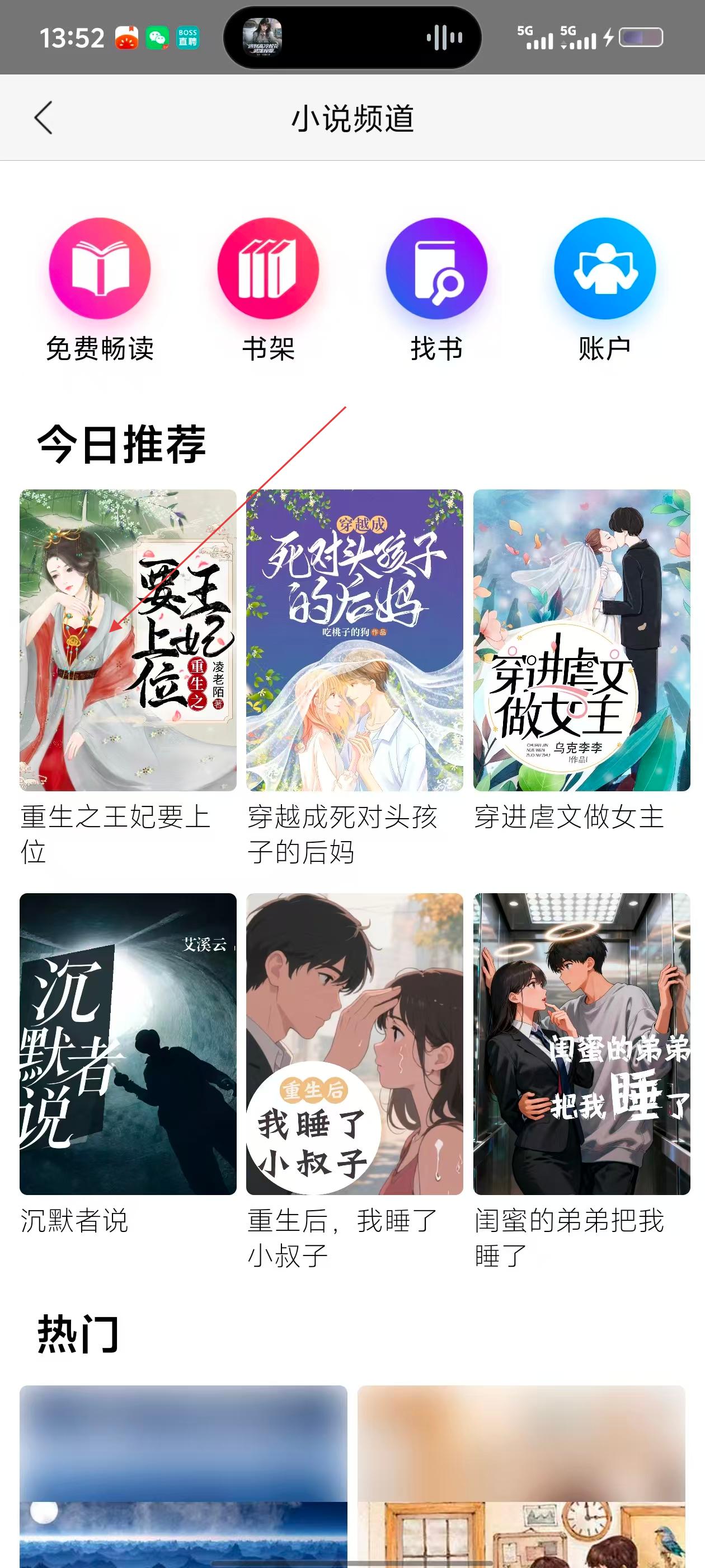 3、进入小说频道,有【免费畅读】【书架】等功能,还有今日推荐小说,可选择感兴趣的小说查看。