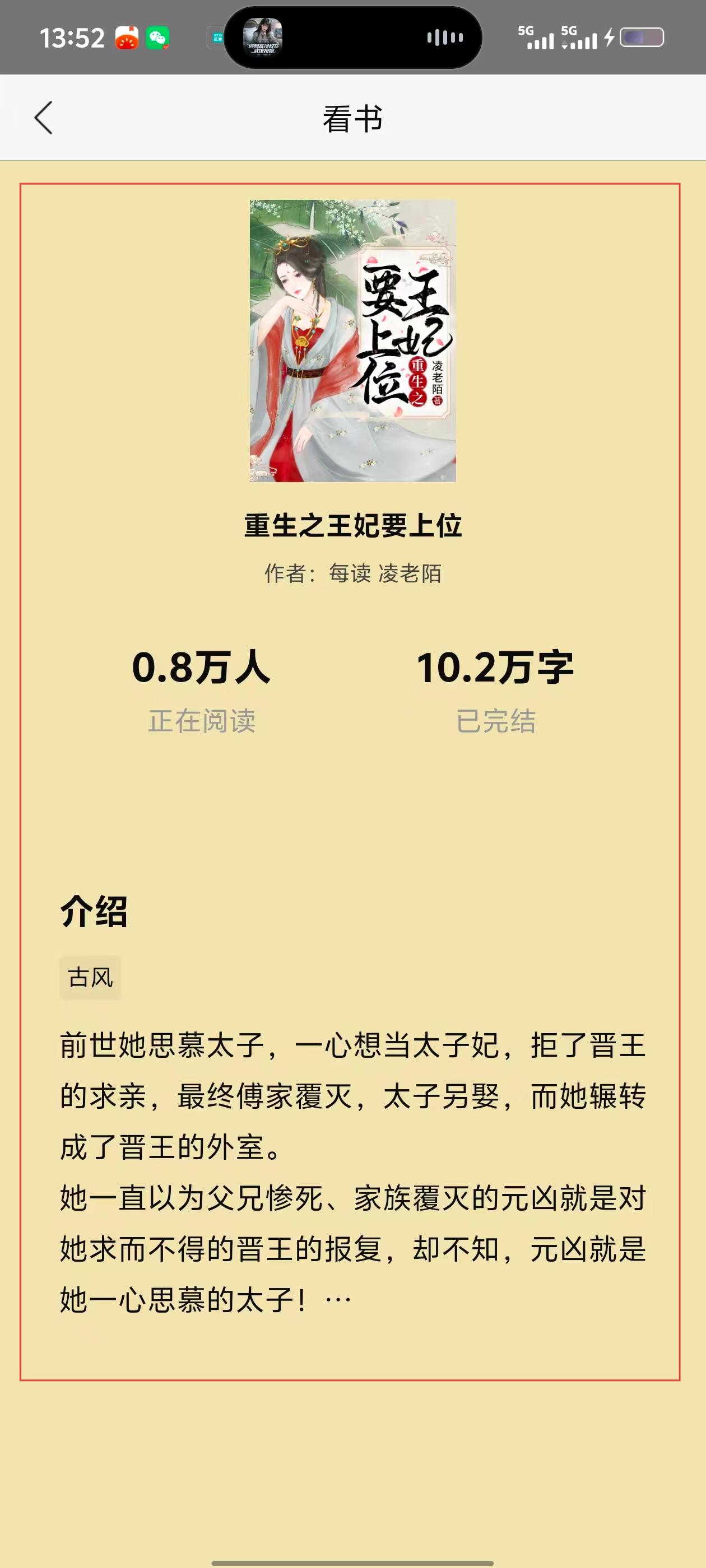 4、点击感兴趣的小说,如【重生之王妃要上位】,可进入该书详情页,查看简介、阅读人数等信息后阅读。