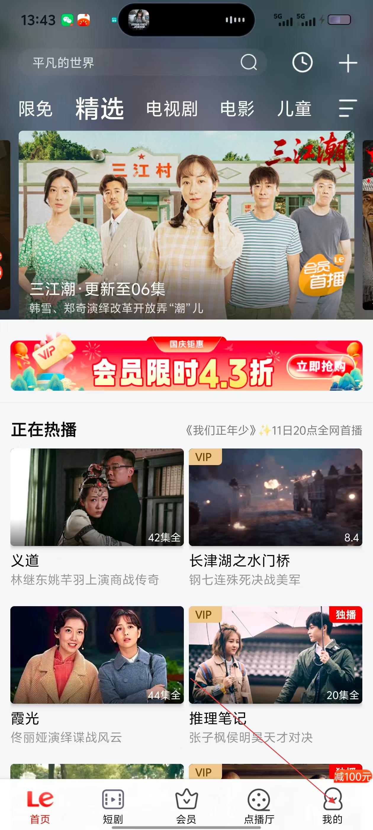 1、进入乐视视频首页,有【限免】【精选】等分类,还有会员限时4.3折活动,点击【我的】可进入个人页面。