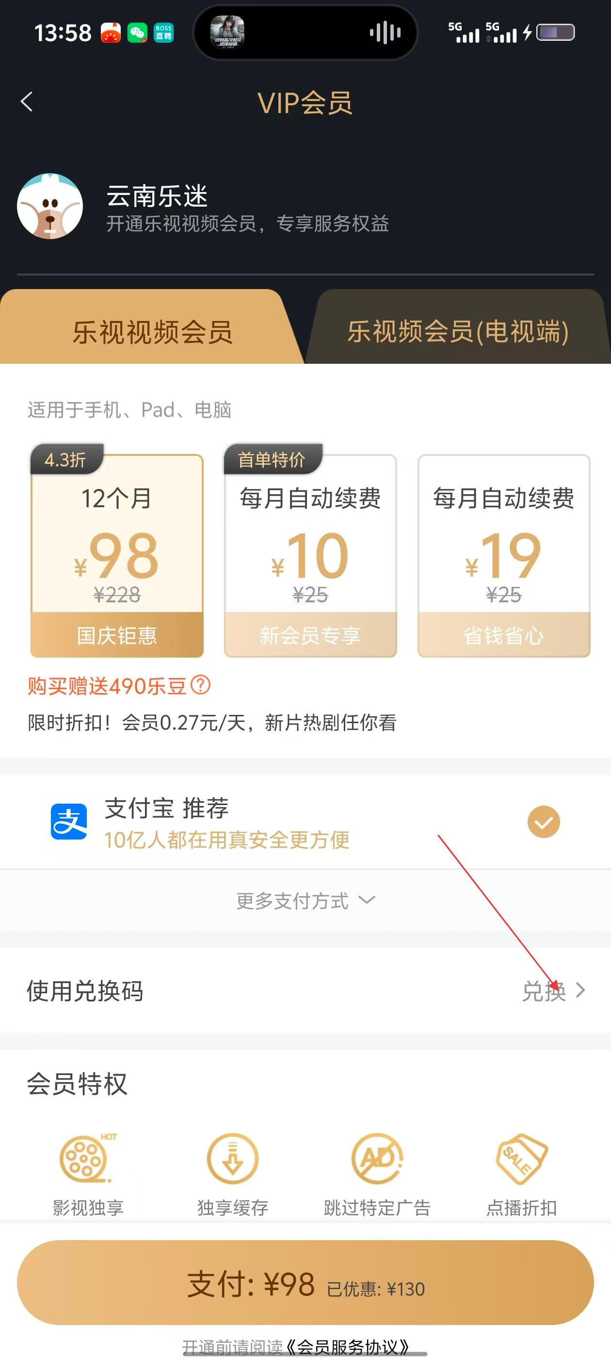 3、进入VIP会员页面,有不同时长和价格的会员套餐,可选择合适的套餐,还能查看会员特权等信息,若有兑换码,点击兑换。