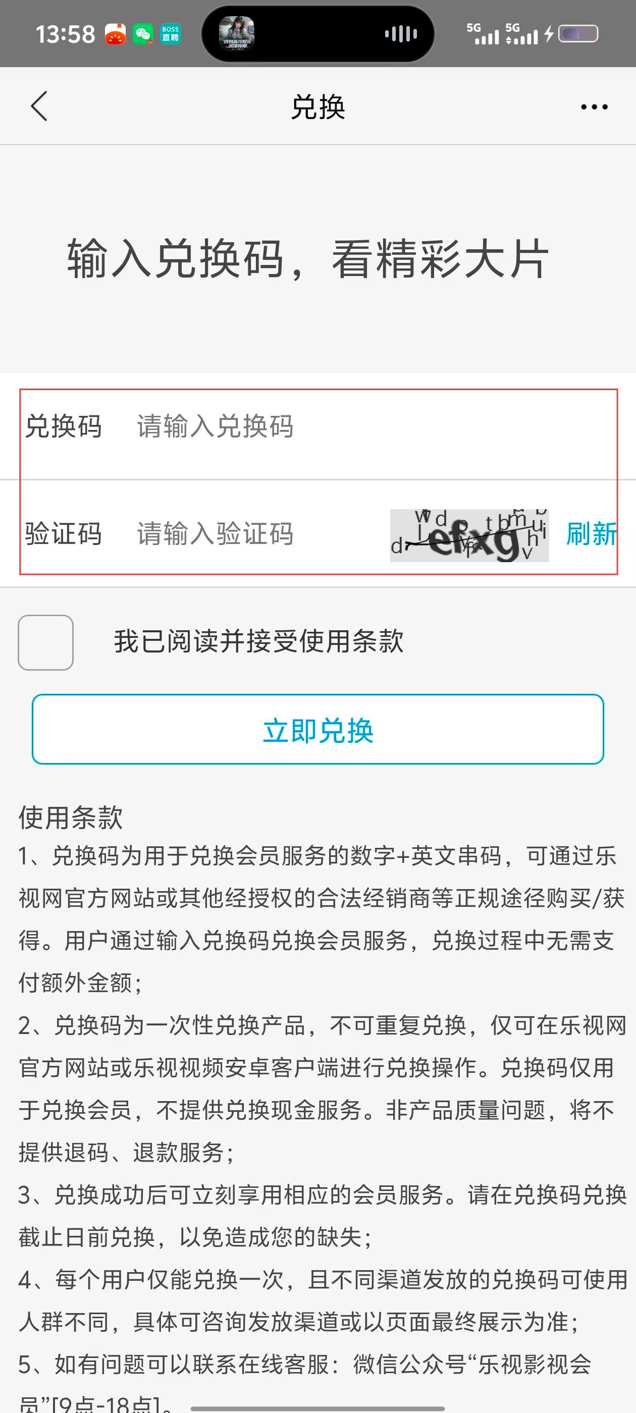 4、进入兑换页面,输入兑换码和验证码,勾选同意使用条款后,点击【立即兑换】即可兑换会员服务。