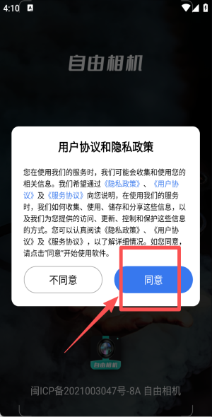 1、点击“同意”接受协议,开启自由相机全部功能权限。
