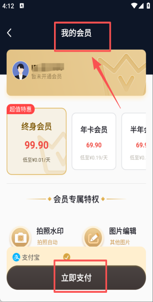 4、选“我的会员”挑年卡或终身,支付后即可解锁专属水印特权。