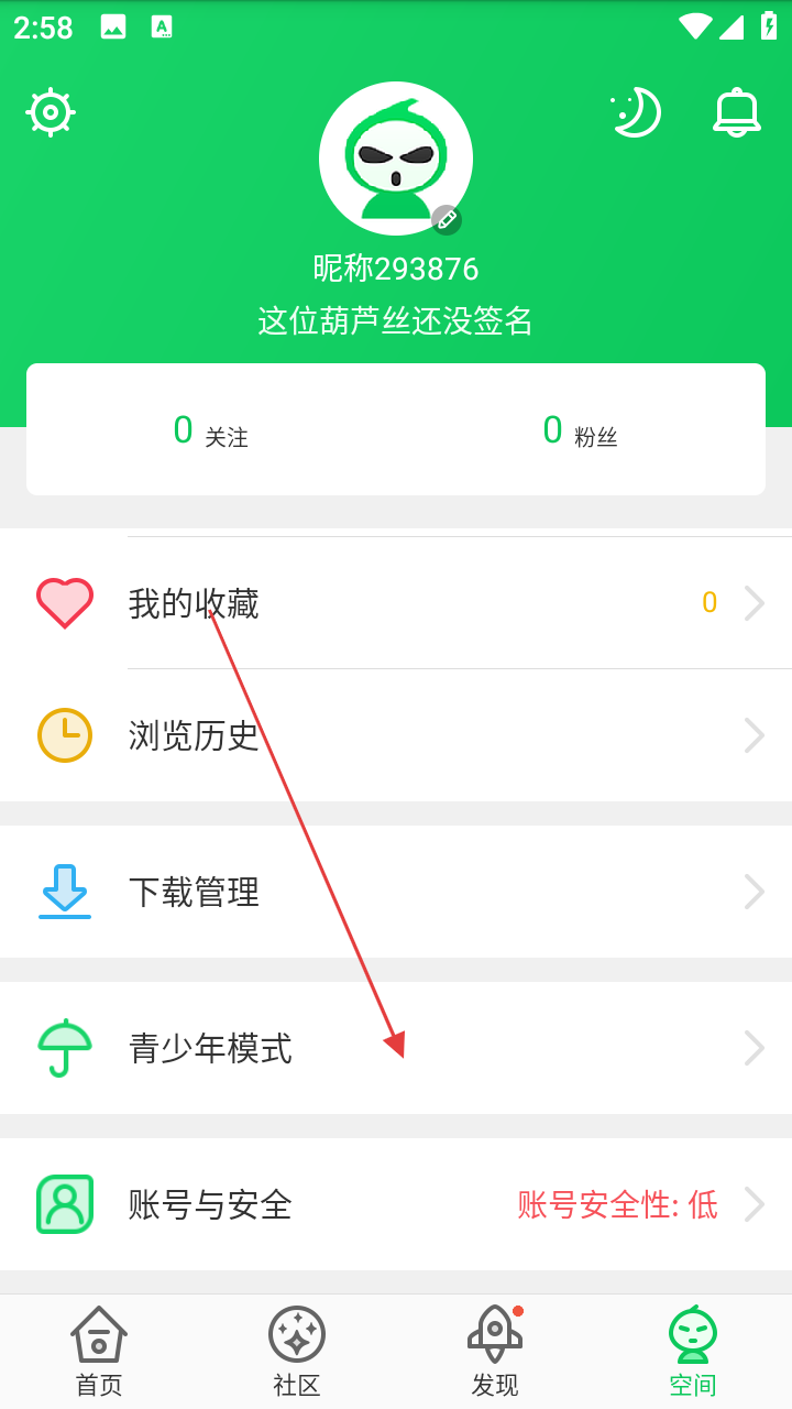 2、进入个人空间后,点击【青少年模式】选项,可进入青少年模式设置页面。