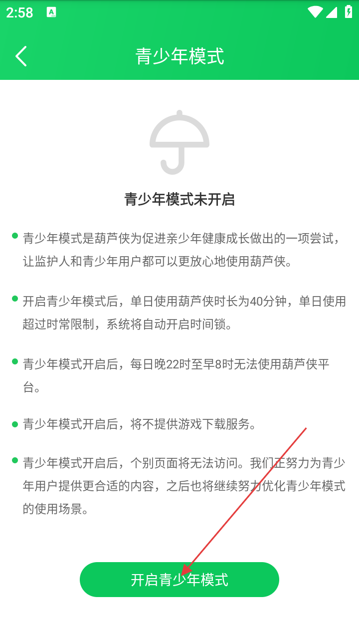3、在青少年模式设置页面,可查看模式相关说明,点击【开启青少年模式】按钮可开启该模式。
