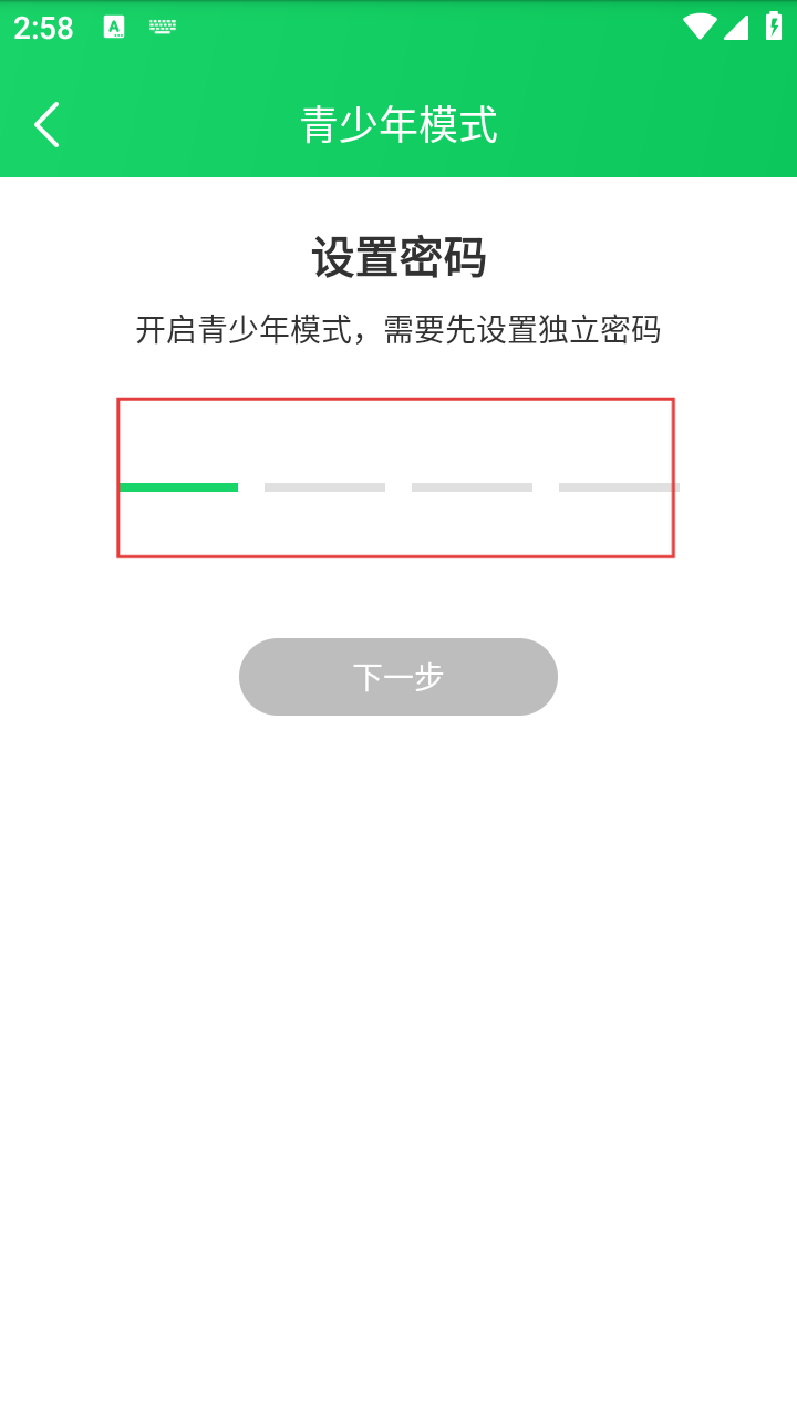 4、开启青少年模式时,需先设置独立密码,按提示输入密码后点击下一步即可完成设置。