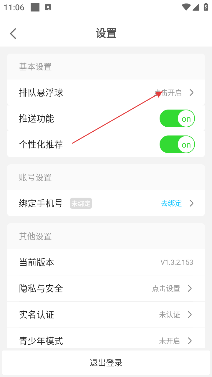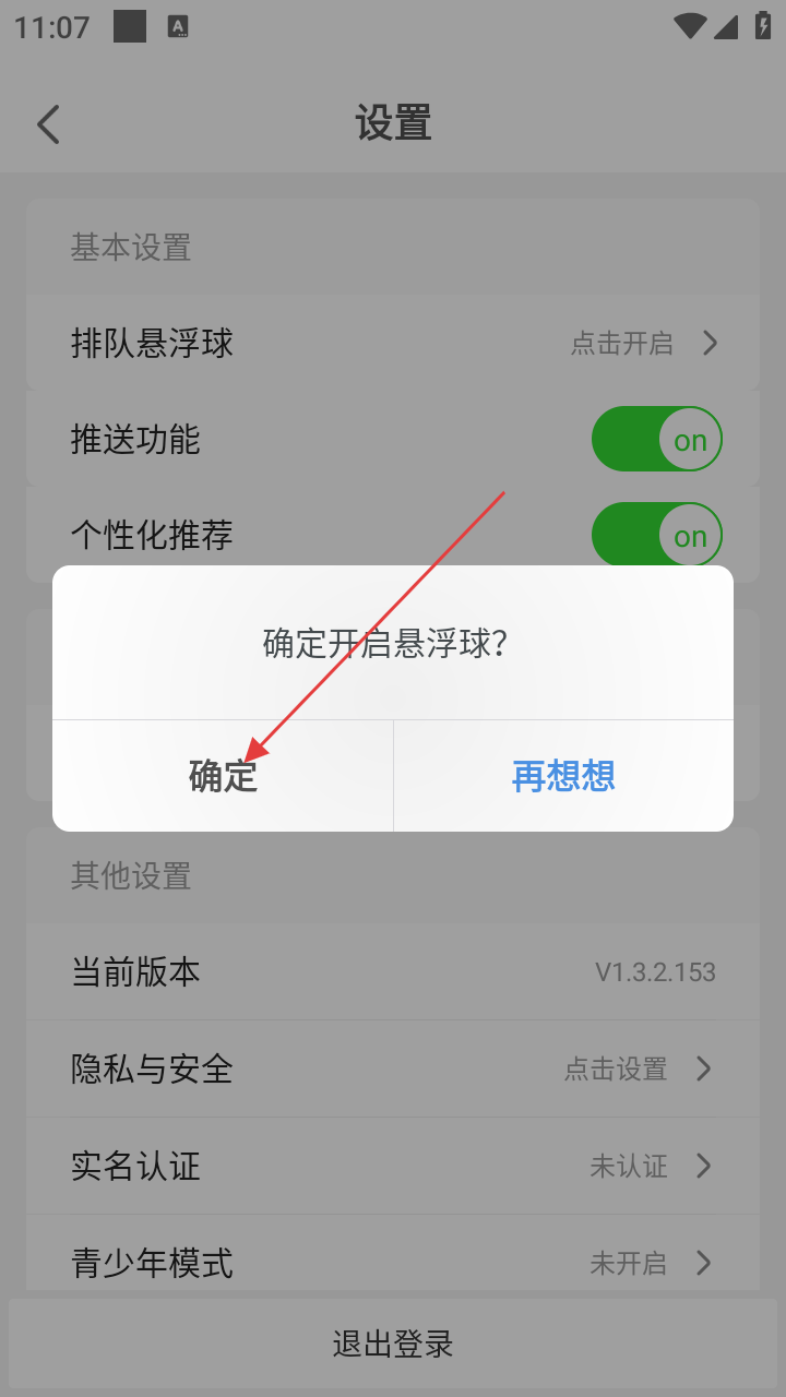 3、在设置页面,点击【排队悬浮球】选项,弹出确认开启悬浮球的提示框。