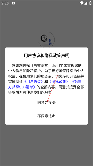 1、进入书亦课堂后,先点击【同意并接受】《用户协议和隐私政策声明》,进入首页。