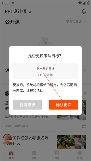 2、在“是否更换考试目标?”弹窗中,点击【确认更换】,进入目标选择界面。
