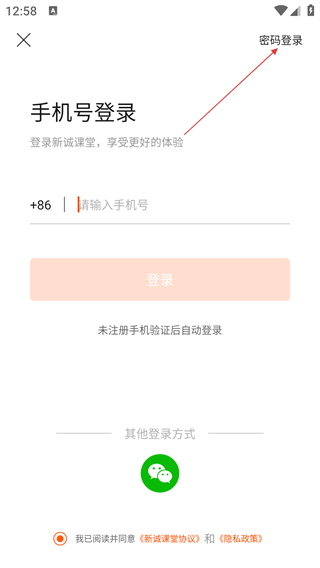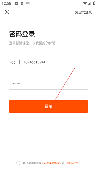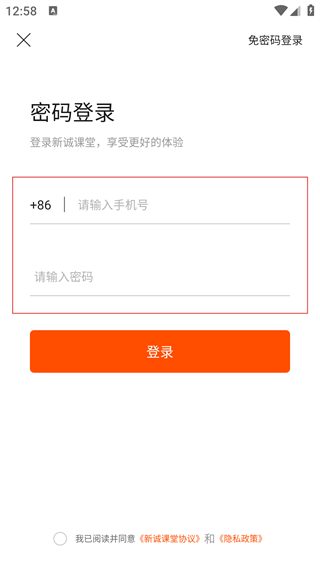 3、在密码登录页,依次输入手机号、密码,勾选《新诚课堂协议》和《隐私政策》。