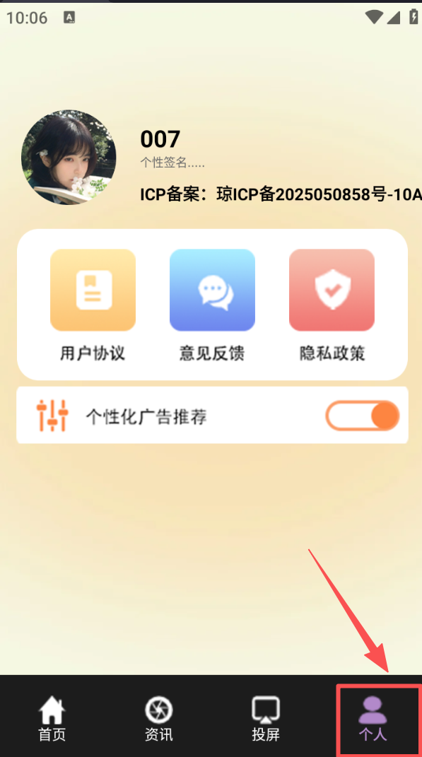 4、点击 “个人”,可查看用户协议、意见反馈、隐私政策等信息,也能管理个性化广告推荐设置。
