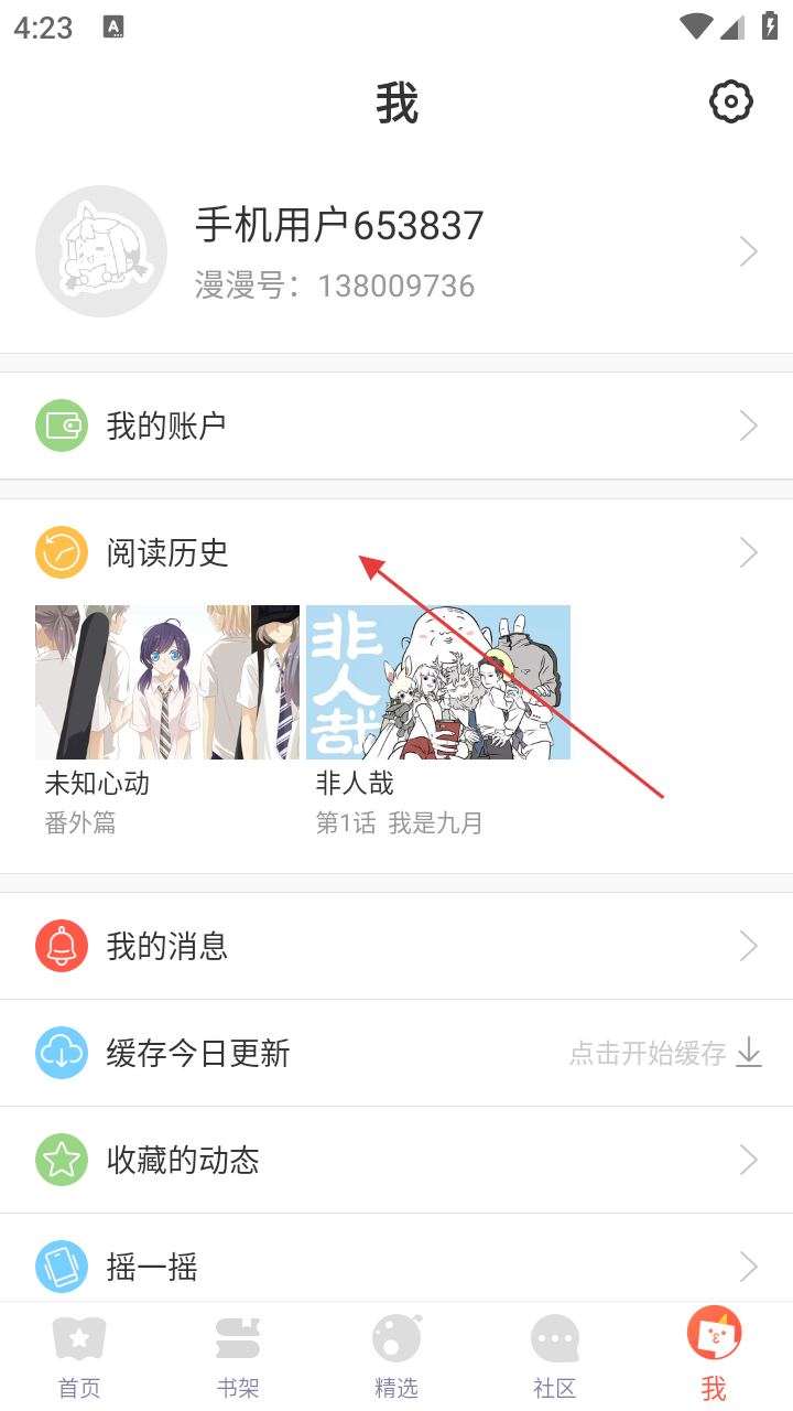 2、在个人相关页面,点击【阅读历史】选项,进入阅读历史页面。