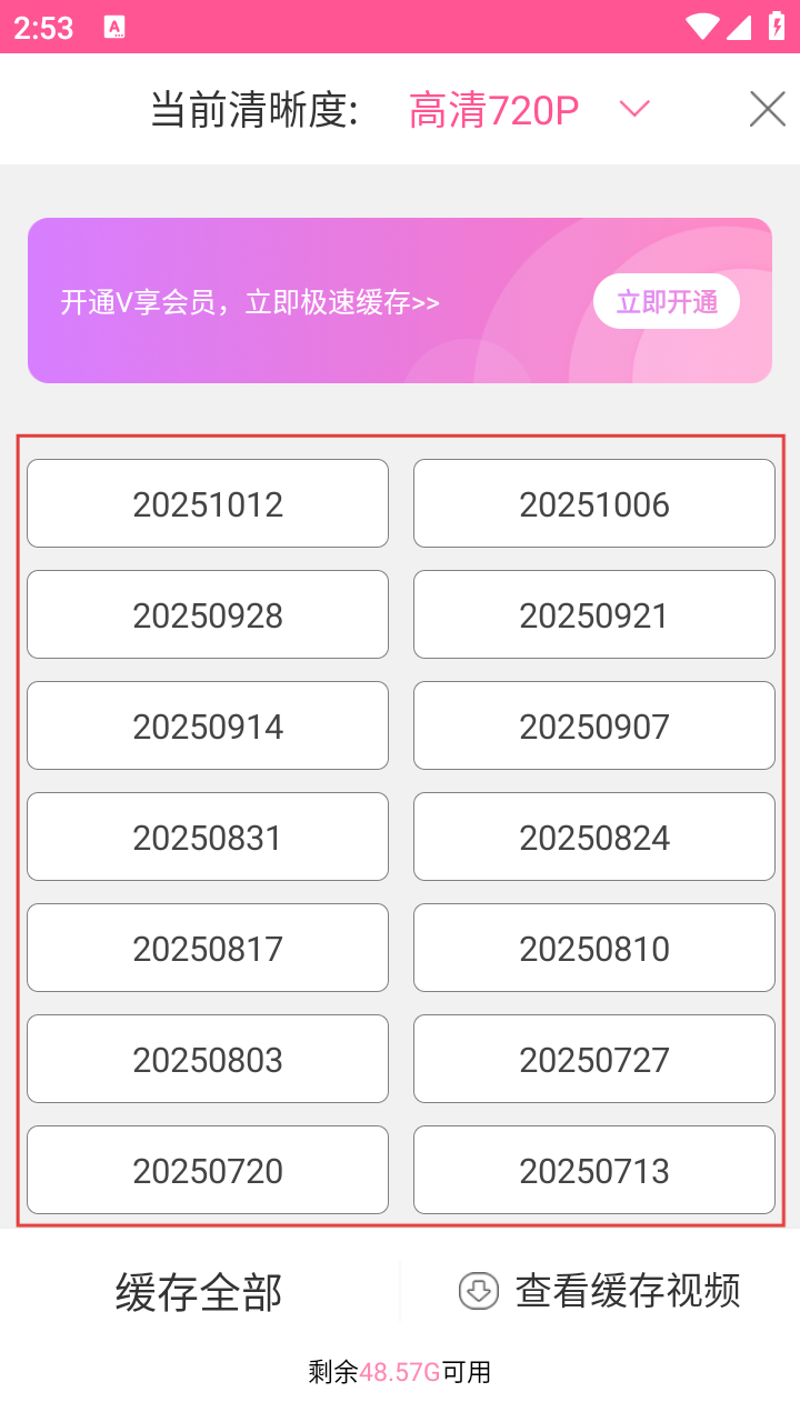 4、在缓存设置界面,选择要缓存的日期,还可点击【缓存全部】,将所有期数缓存下来。