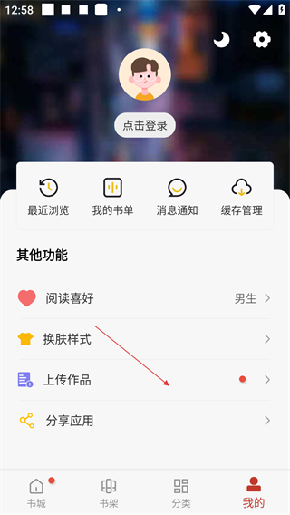 2、在个人中心页面,找到【上传作品】选项并点击,进入作品上传的功能界面,支持漫画、小说类内容的上传。