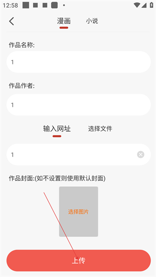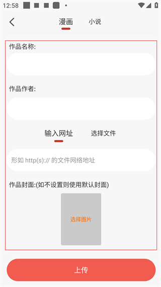 3、在上传界面,需填写【作品名称】【作品作者】,选择【输入网址】或【选择文件】添加作品资源,还可设置作品封面。
