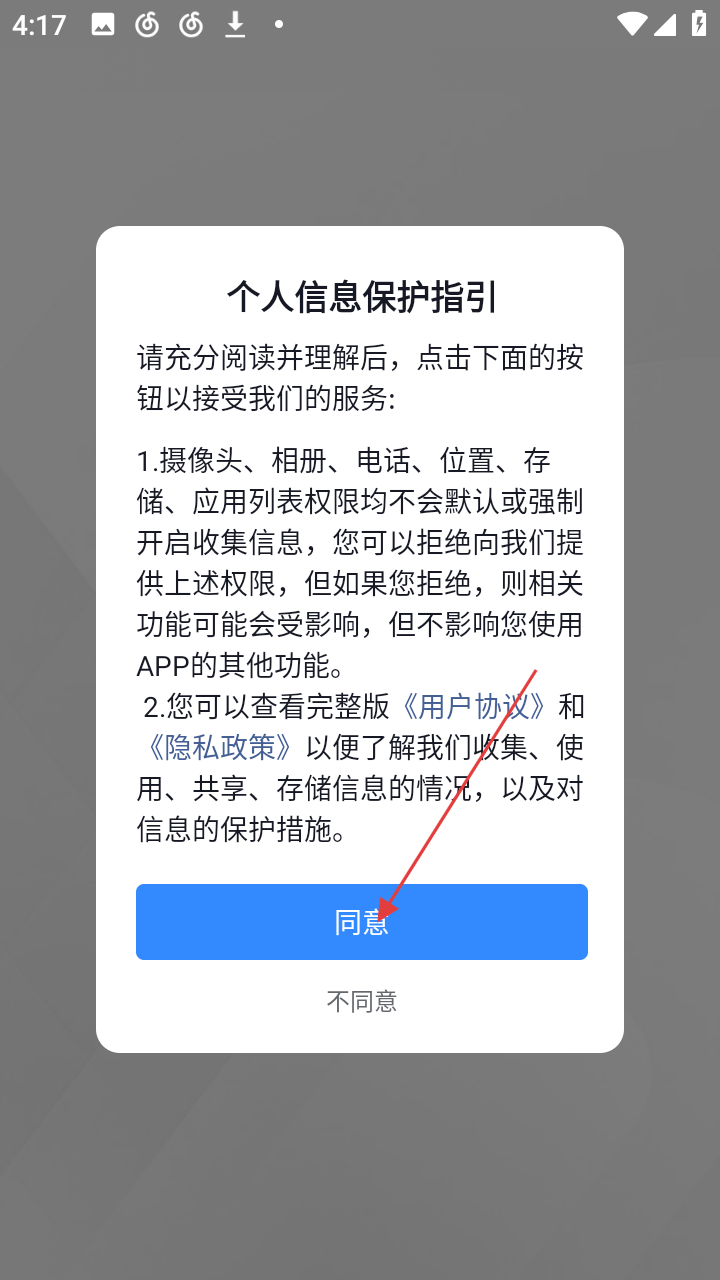 1、打开抖音来客,会弹出【个人信息保护指引】弹窗,仔细阅读后,点击【同意】按钮,进入登录页面。