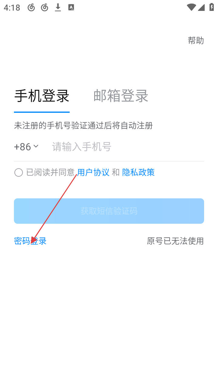 2、在登录页面,选择【手机登录】,若想密码登录,点击【密码登录】选项,切换到密码登录界面。