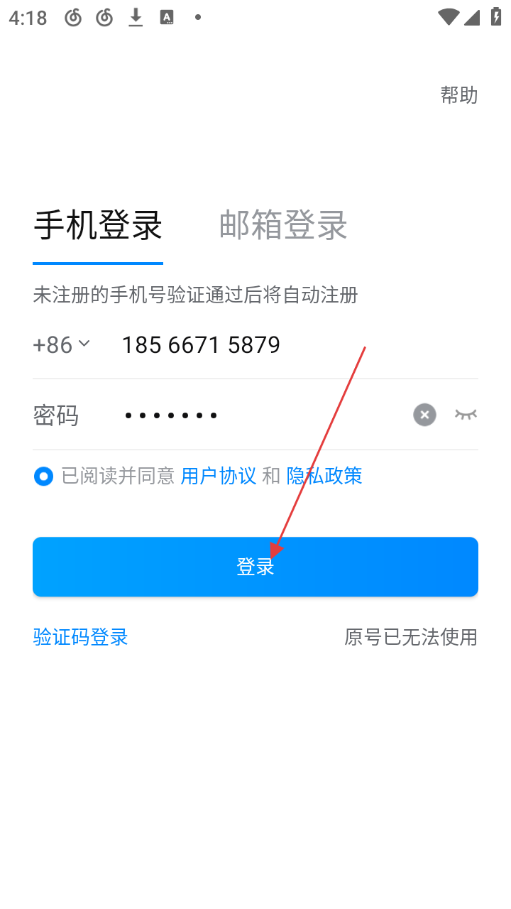 4、输入好手机号和密码后,勾选【已阅读并同意用户协议和隐私政策】,点击【登录】按钮,完成登录。