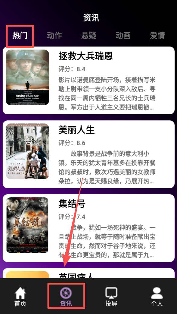 2、点击 “资讯”,能在热门分类下查看影视资讯,了解影片评分与剧情梗概。