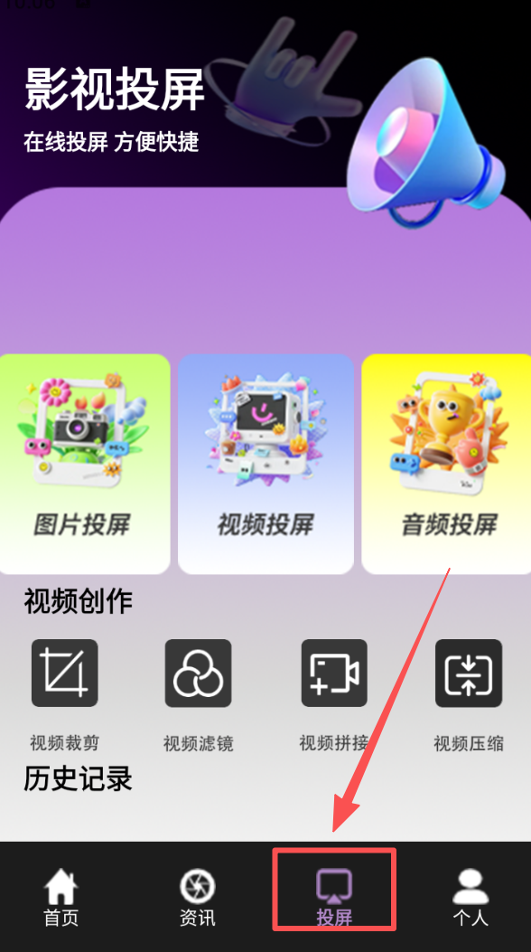 3、点击 “投屏”,可使用图片投屏、视频投屏、音频投屏功能,还能进行视频裁剪、滤镜等创作操作。