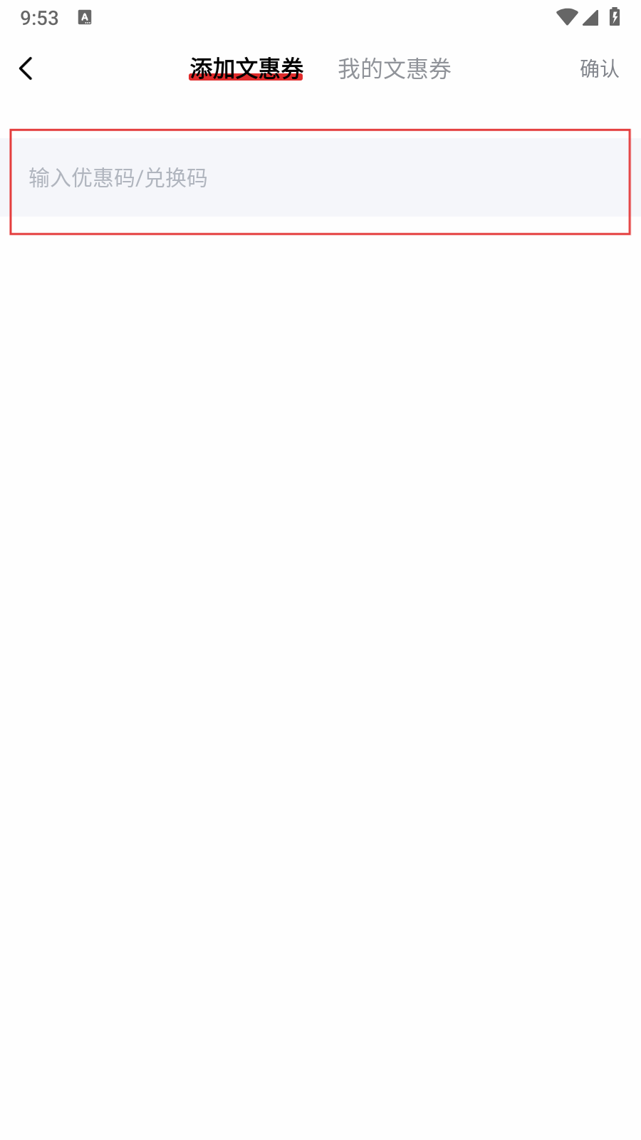 4、在添加文惠券页面输入兑换码后,点击【确认】即可完成文惠券添加,享受相应优惠权益。
