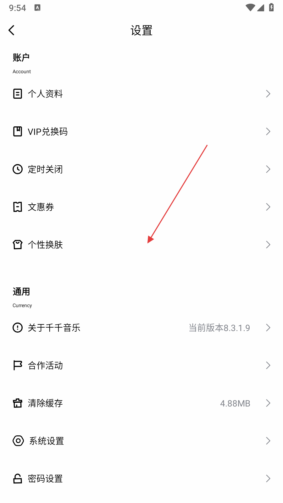 2、在个人中心页面点击右上角设置图标,进入设置页面,可看到个性换肤等设置项。