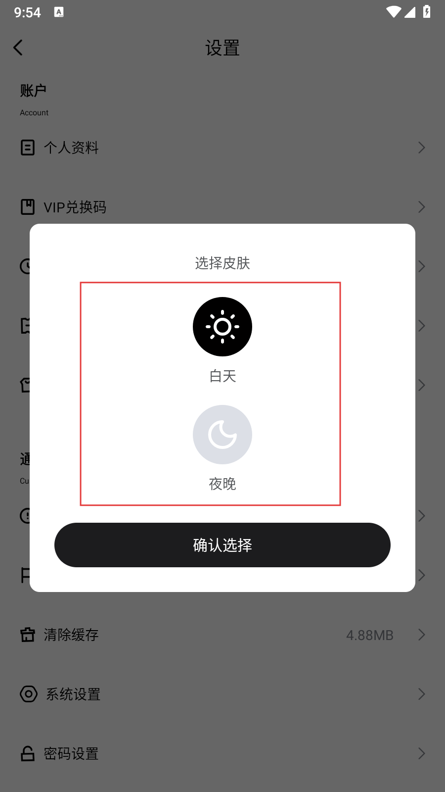 3、在设置页面点击【个性换肤】,弹出皮肤选择窗口,可选择白天或夜晚皮肤模式。