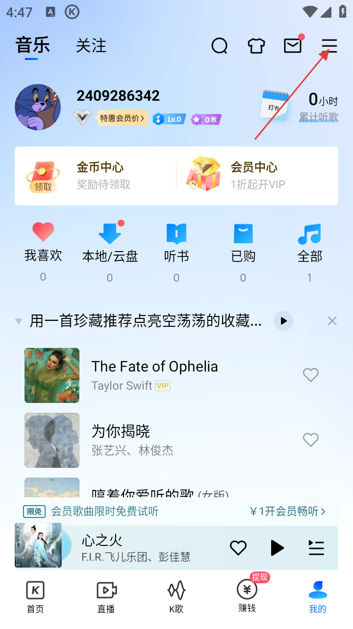 1、在酷狗音乐首页,点击底部的【我的】选项,进入个人中心页面。