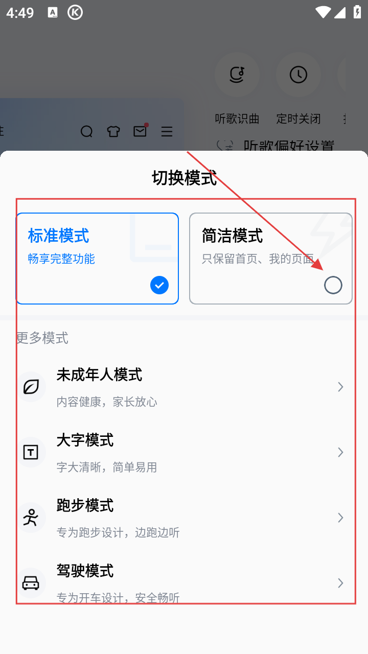4、在模式切换页面,可选择【简洁模式】等不同模式,切换酷狗音乐的使用模式。
