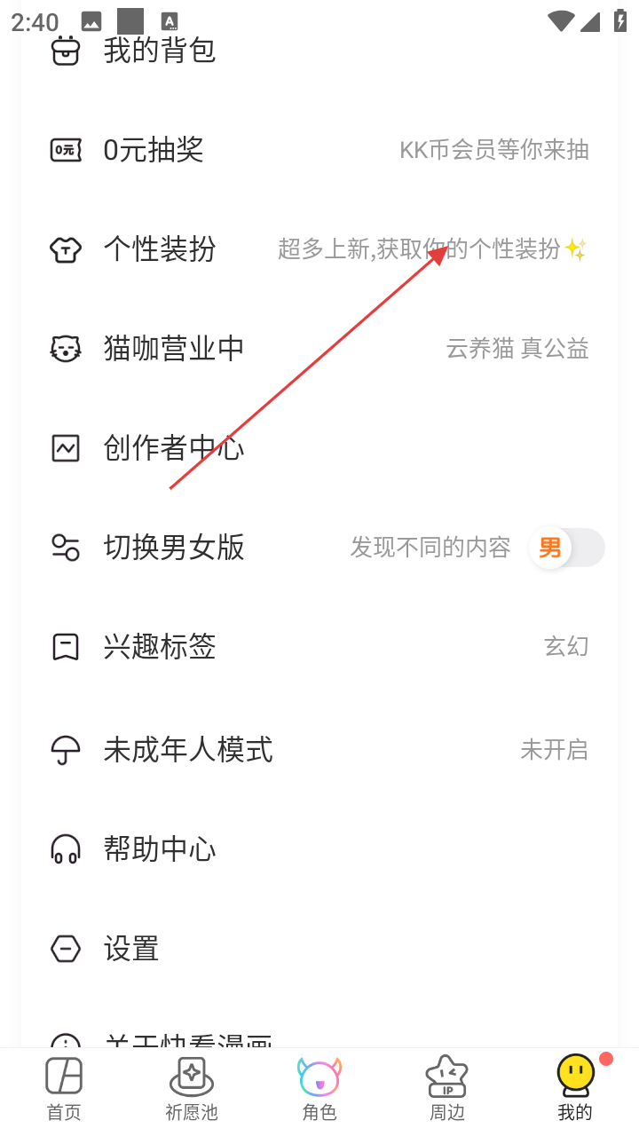2、在个人相关页面,找到【个性装扮】选项并点击,进入装扮相关页面。