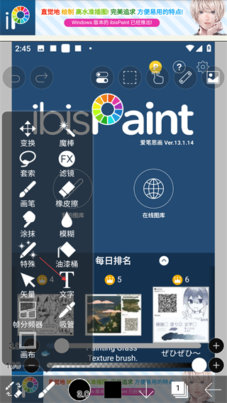 1、进入ibisPaint(爱笔思画)主界面,点击【我的图库】可管理个人创作作品,也能通过【在线图库】获取素材。