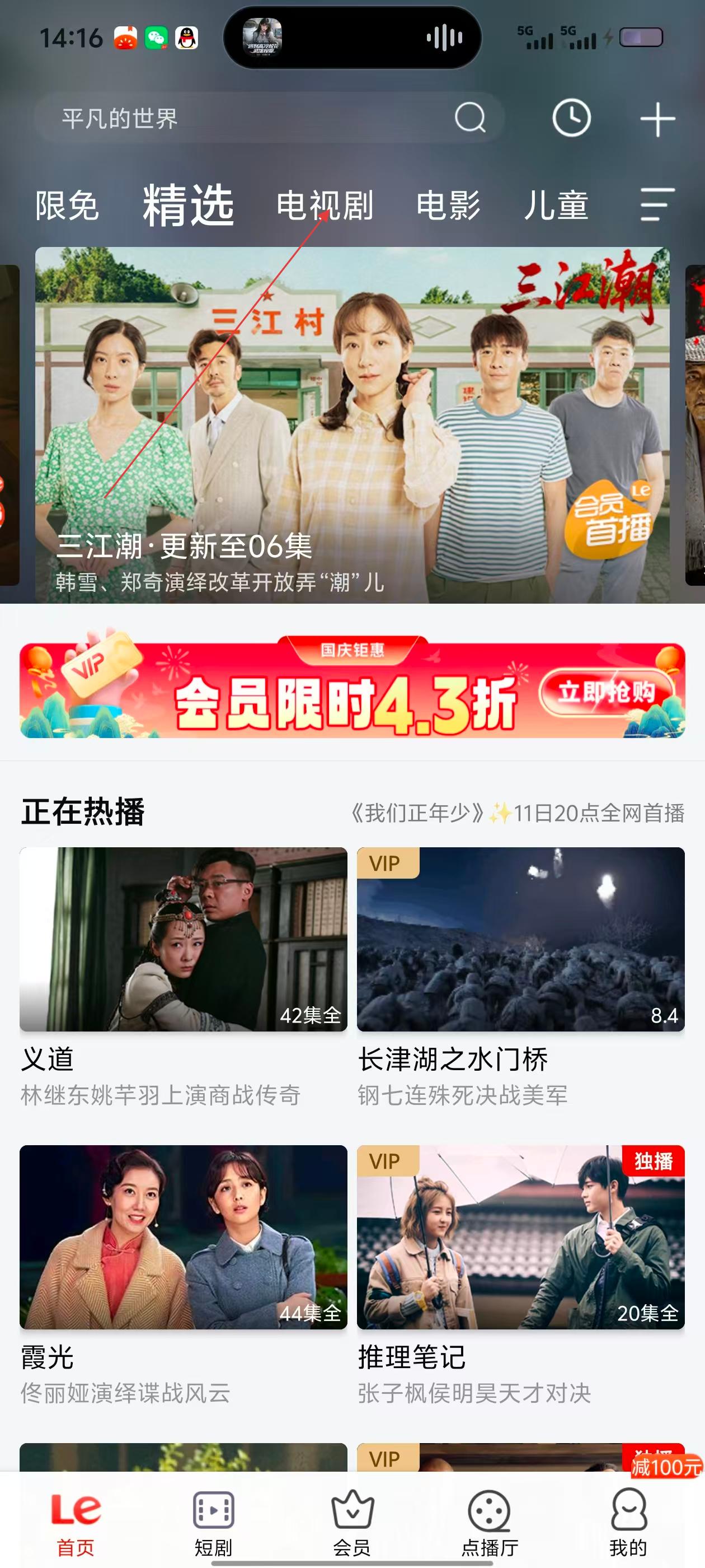 1、进入乐视视频首页,有【限免】【精选】等分类,还有会员限时4.3折活动,点击【电视剧】可进入电视剧板块。