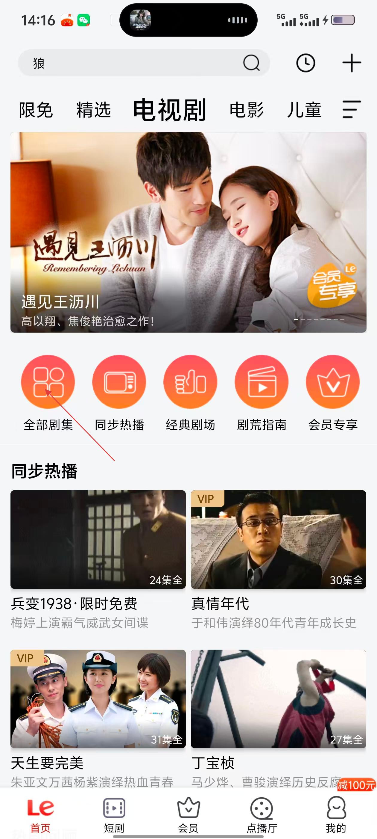2、在电视剧板块,有《遇见王沥川》等推荐剧集,还有【全部剧集】【同步热播】等功能入口,可按需选择。