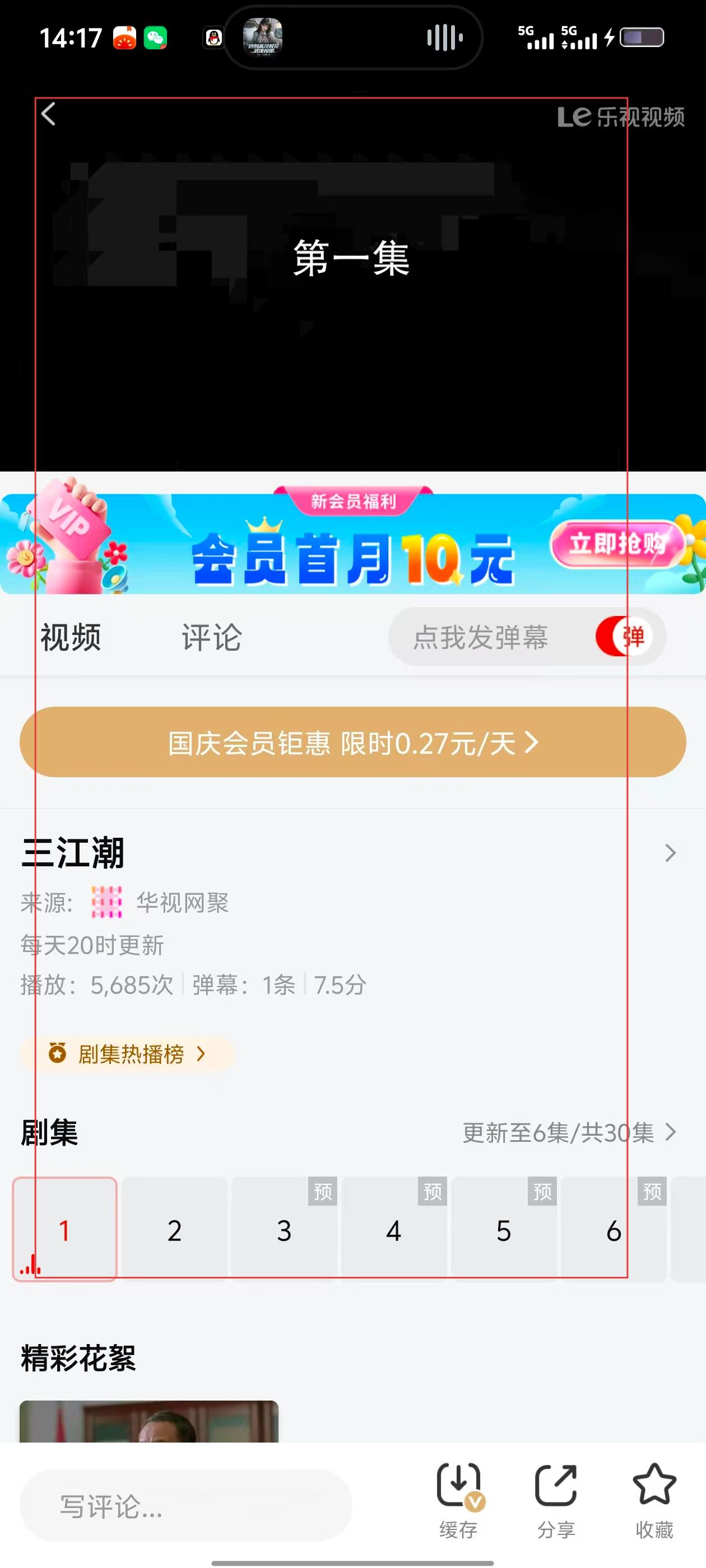 4、选中剧集后,进入播放页面,可选择集数观看,还能查看剧集播放量、评分等信息,也可进行缓存、分享等操作。