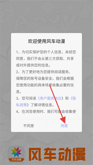 1、打开应用后,会弹出【风车动漫】的隐私协议提示,点击【同意】按钮,即可进入应用主界面。