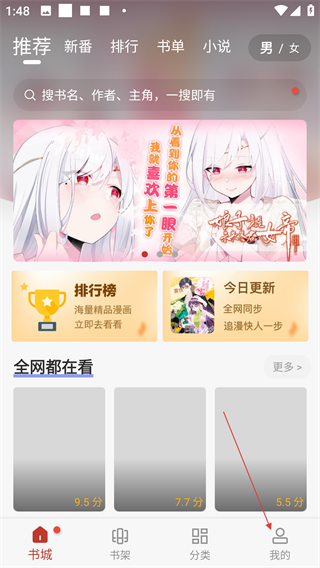 2、进入应用的【书城】页面,可浏览推荐漫画、排行榜等内容,点击底部【我的】选项,进入个人中心页面。