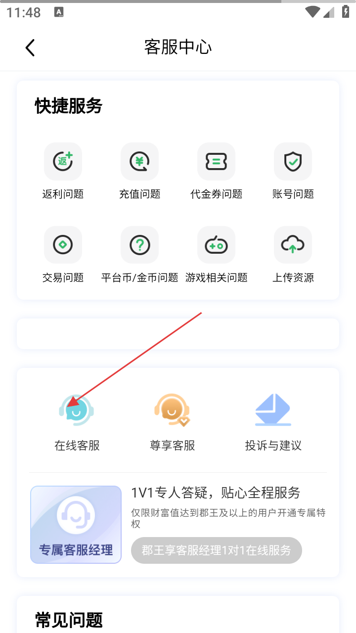 3、在客服服务界面,点击【在线客服】,进入与客服机器人的交流页面。