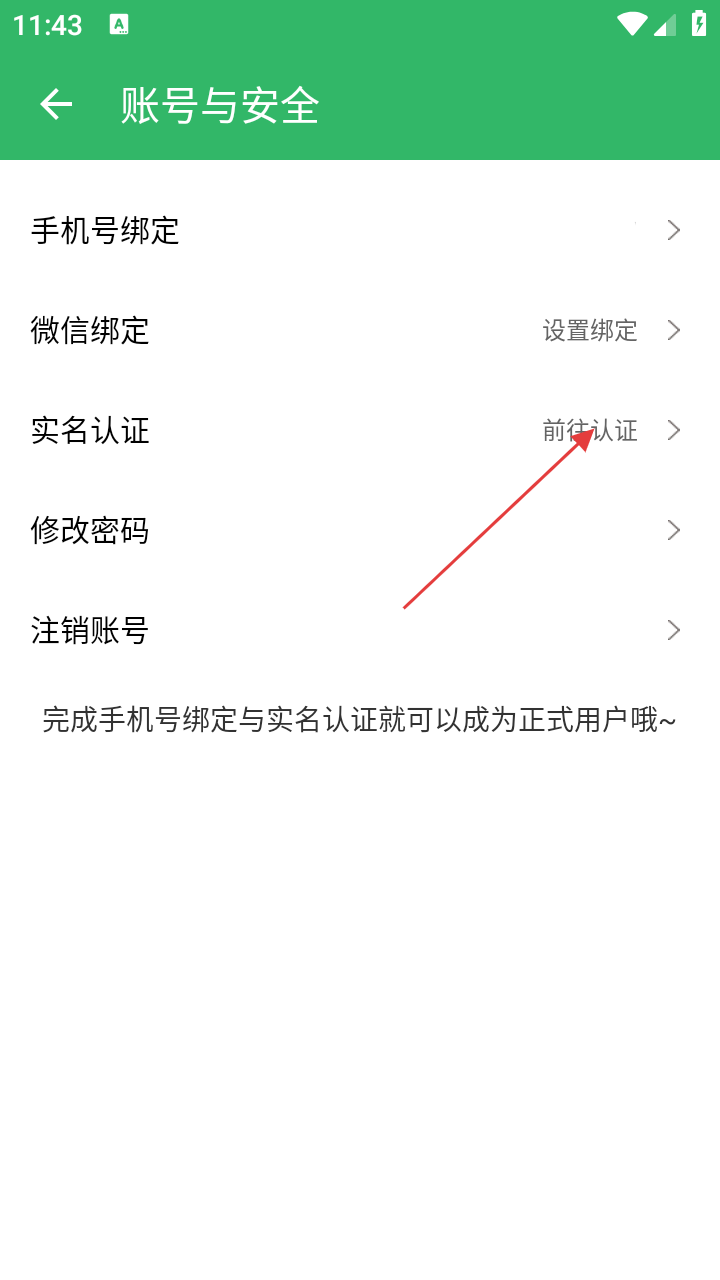 4、在账号与安全页面,点击【实名认证】,按提示完成实名认证,可成为正式用户。